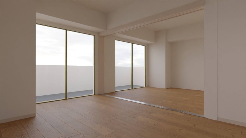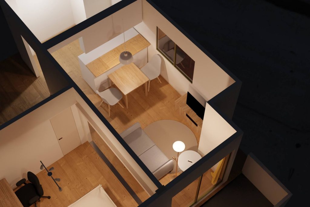 エントリーナンバー①、8畳のワンルーム。基本的に1人、たまに2人になる分には十分じゃない?と思ってBlenderで簡単なパースを作って、家具などを置いてみると、思ったより狭いぞ‥。そしてVRで見てみるとやっぱり窮屈だ、となり却下。