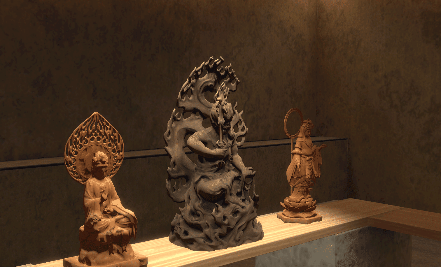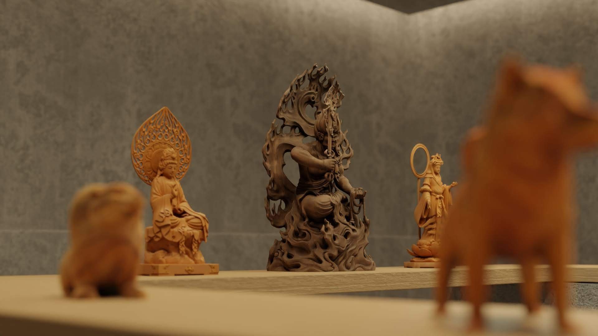 また、ワールド内に魅力的なコンテンツを用意できない理由に、ハードウェアの処理能力の問題もある。3Dのコンテンツは画像や文章とは比較にならないほど処理が重く、高性能なハードウェアが要求される。バーチャル井波はスマートフォンでもストレスなく動くように容量が50MB以下になるよう設計している。ただ、4Kの写真を1枚入れただけで容量を20MBも喰ってしまうため、圧縮に圧縮を重ねて、やむを得ず低解像度の画像を入れている。本当ならば高解像度の彫刻作品を視界いっぱいに並べたいが、低解像度の3Dモデルがただ3体並んでいるだけということになってしまった。