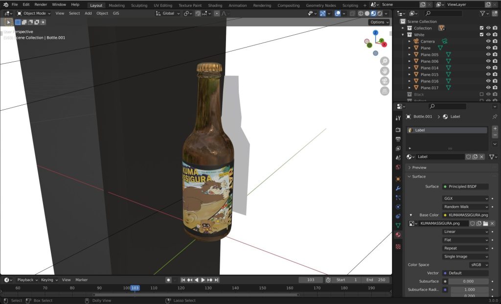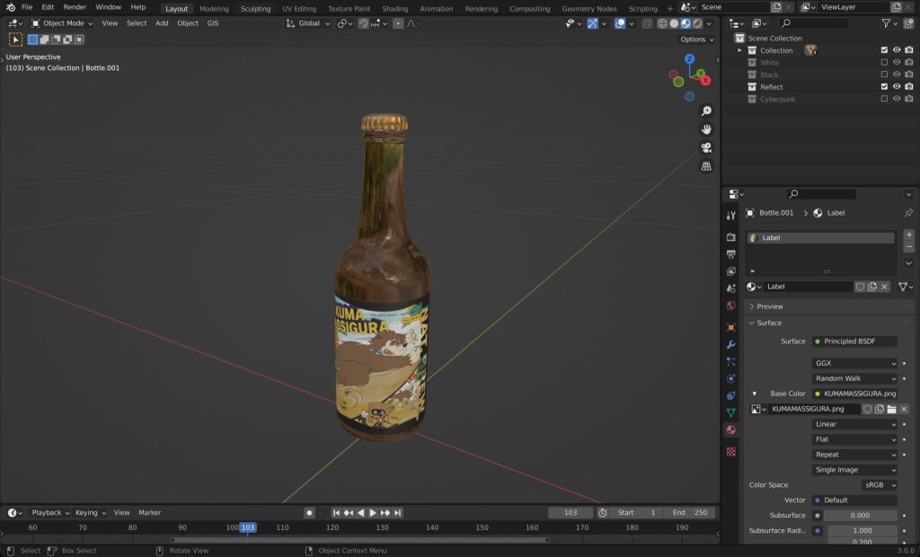 まずはサンプルをいただいて、寸法を測ってBlenderでモデリング。ラベルの入稿データもいただいてテクスチャとして貼り付けます。