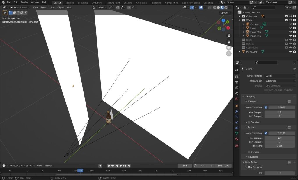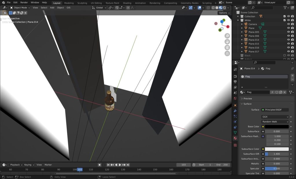 リアルで撮影する場合と同じセットアップで照明を設置していきます。左右のライト、背景のライト、黒締めのためのフラッグ、そして瓶の後ろには瓶の形に切り抜いたアルミ板を置いて液体が見えるようにします。